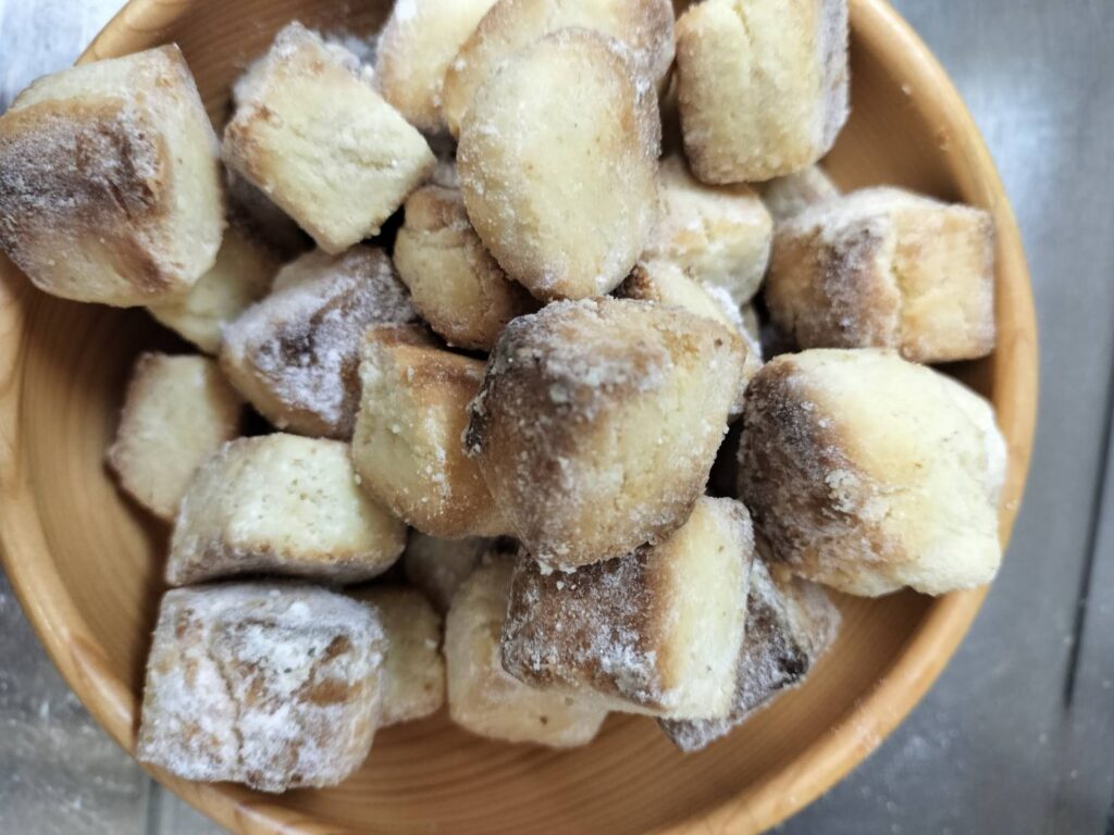 冷やし固めて→切る→焼く→粉砂糖をまぶす→完成✨