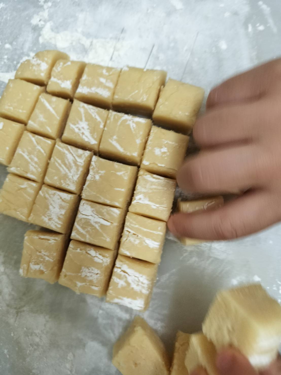 冷やし固めて→切る→焼く→粉砂糖をまぶす→完成✨