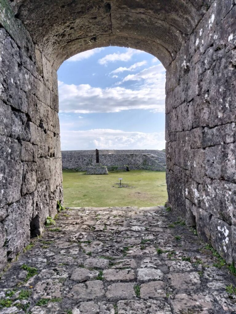 沖縄のグスクらしい、美しい曲線の石垣を見ながら進んでいくと、だんだんと視界が開けてきます。